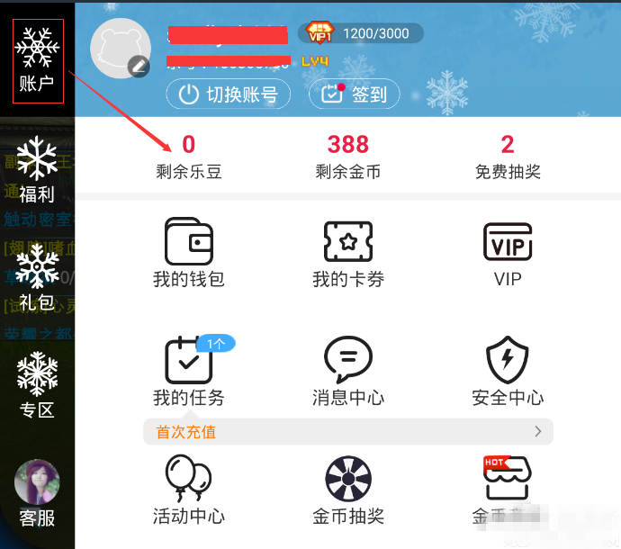打开游戏,登录当乐账号后,点击当乐小熊悬浮窗,选择帐号,点击剩余乐豆,