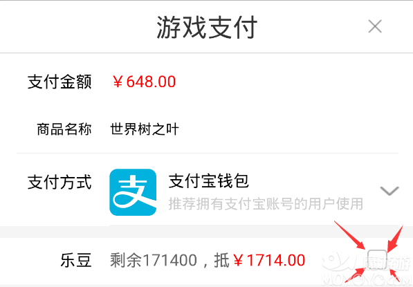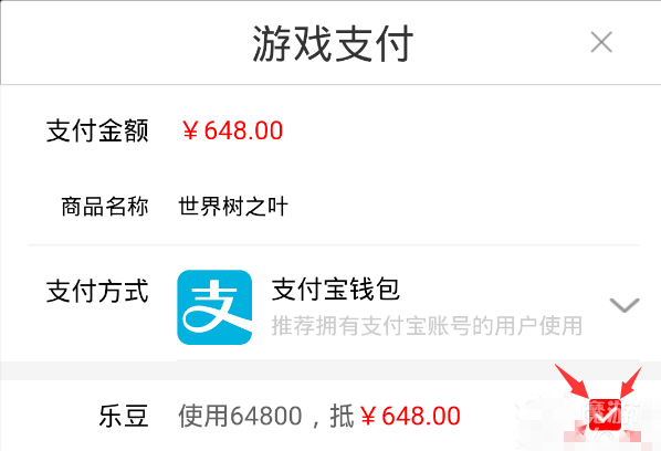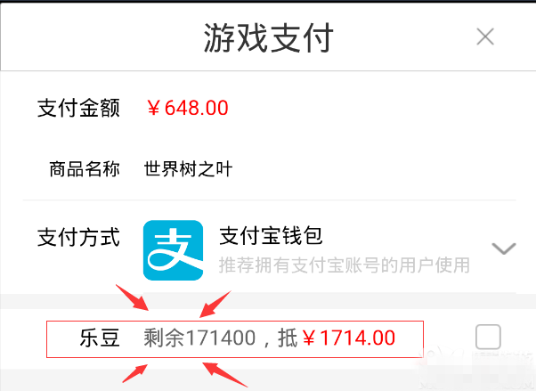 2、进入支付界面后,系统会自动显示您当前账号的可用代金券/定向乐豆,勾选后面的选择框即可;