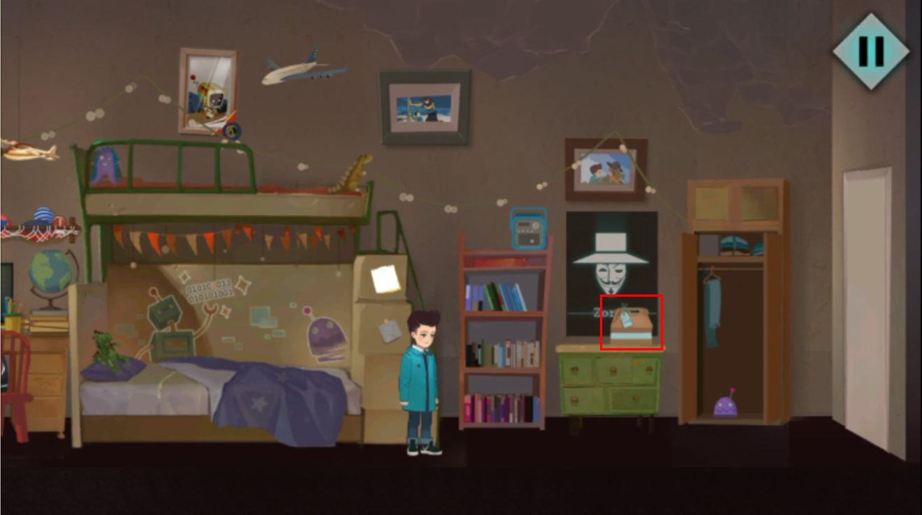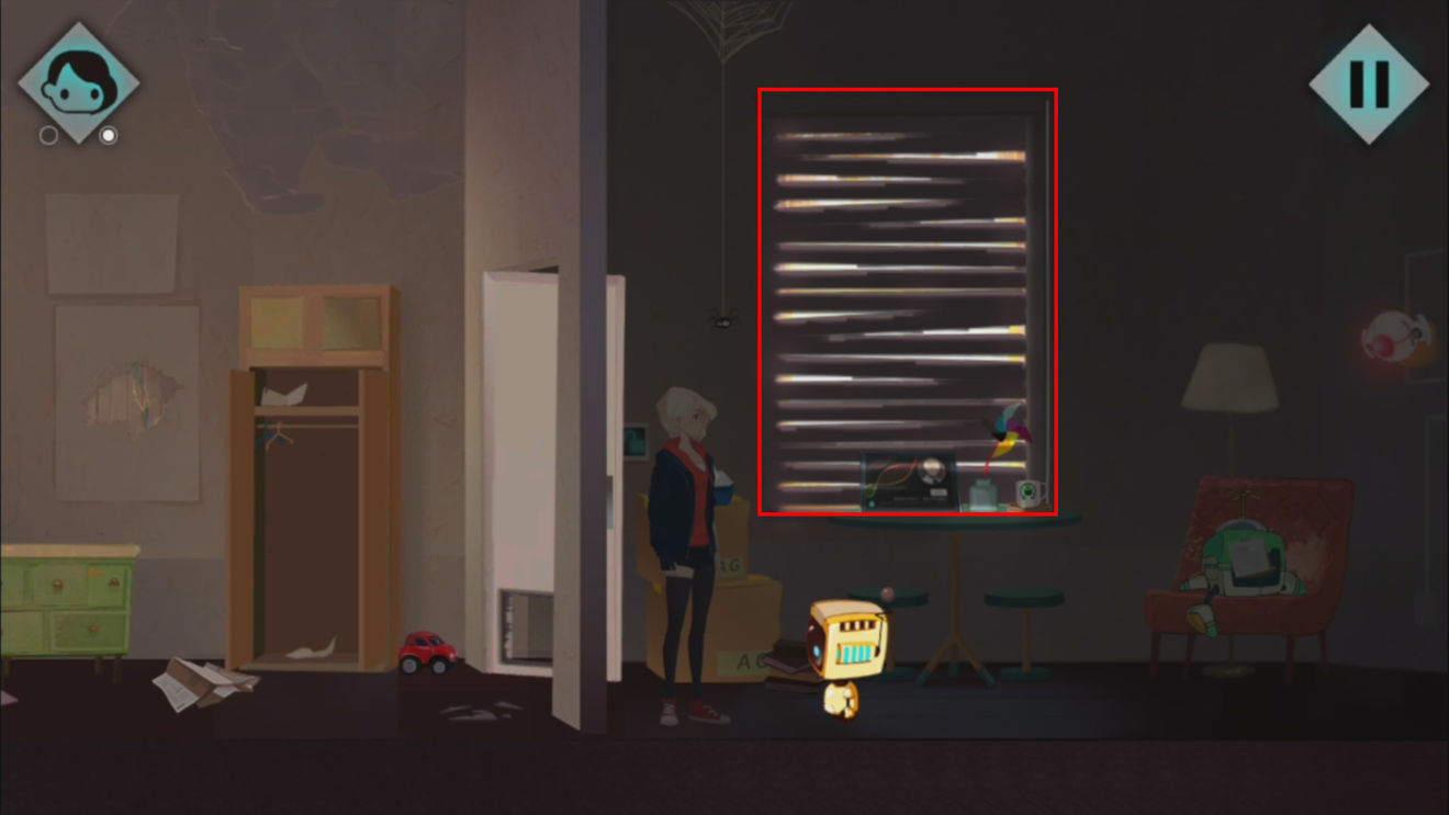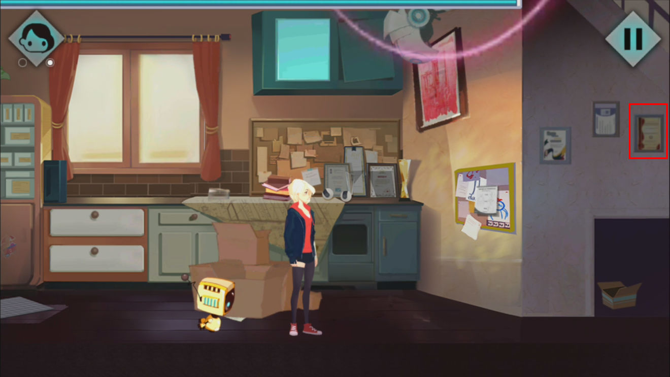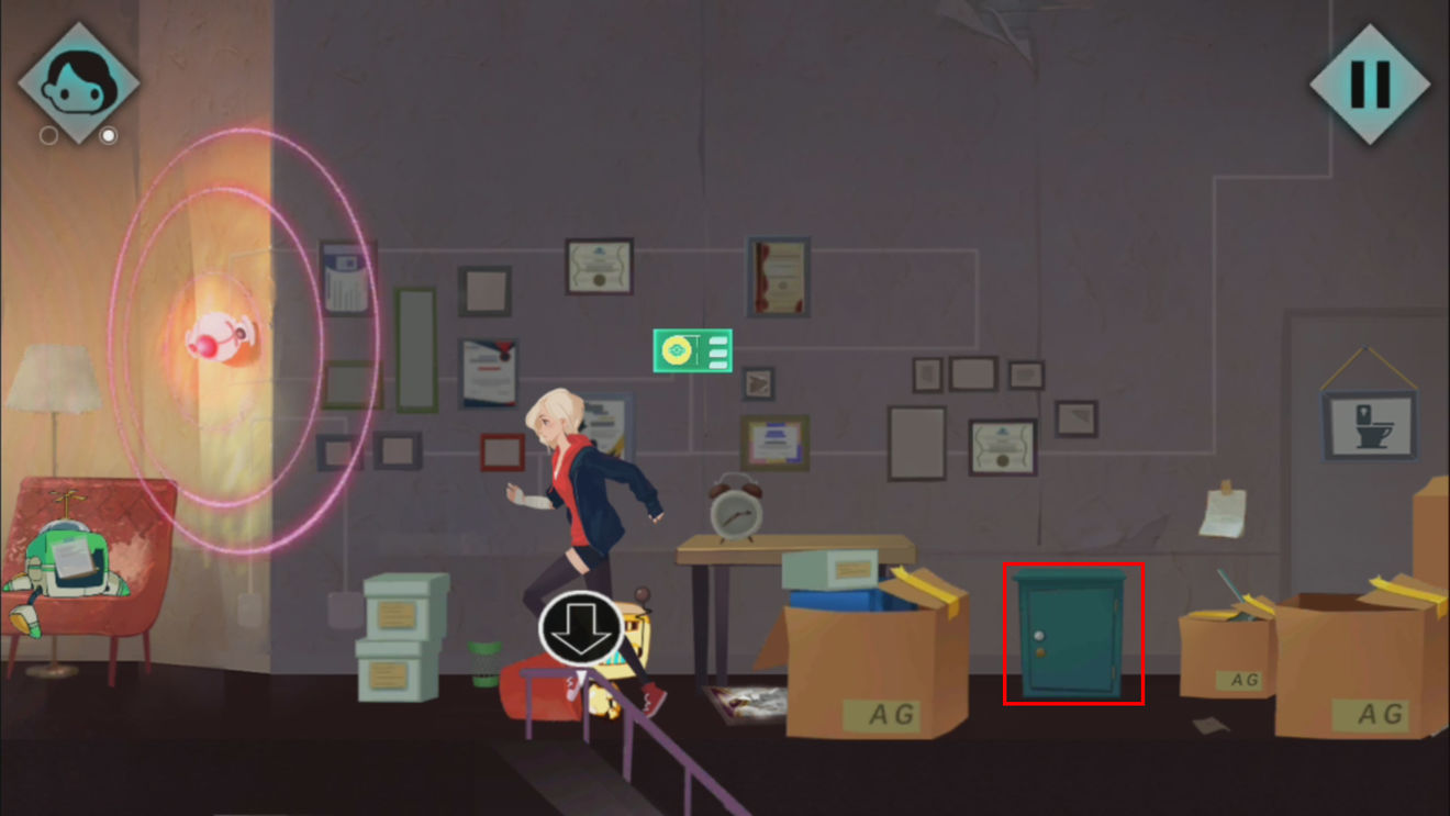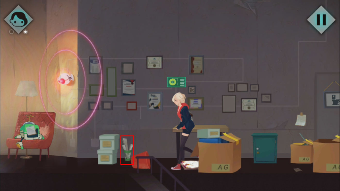关卡第一件物品在这个位置,一个黄色的纸盒。(1/5)(可选择操作:纸盒子旁白有个黑板,可以进行涂鸦,不影响剧情)