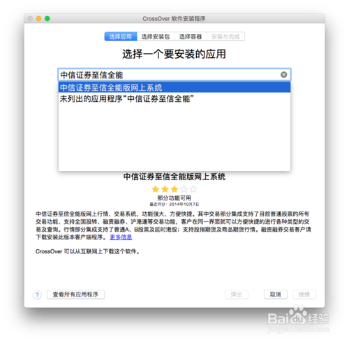 2.然后,运行 CrossOver,点击“安装 Windows 应用程序”按钮。在弹出的窗口中搜索“中信证券至信全能”,然后选中“中信证券至信全能”。点击“继续”和“安装”开始安装中信证券。