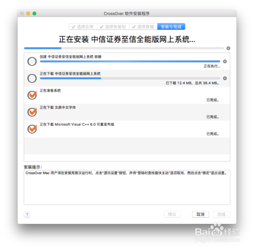 CrossOver 安装中信证券时,如果出现相关依赖下载出错的情况,可以多试试几次,一般都是网络问题