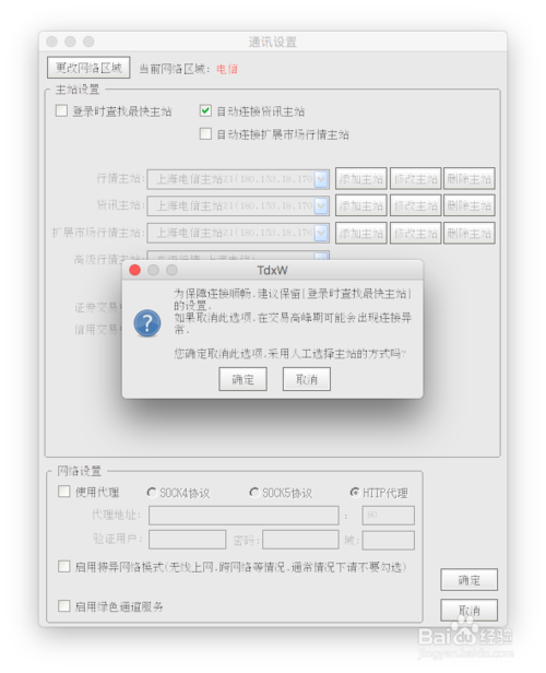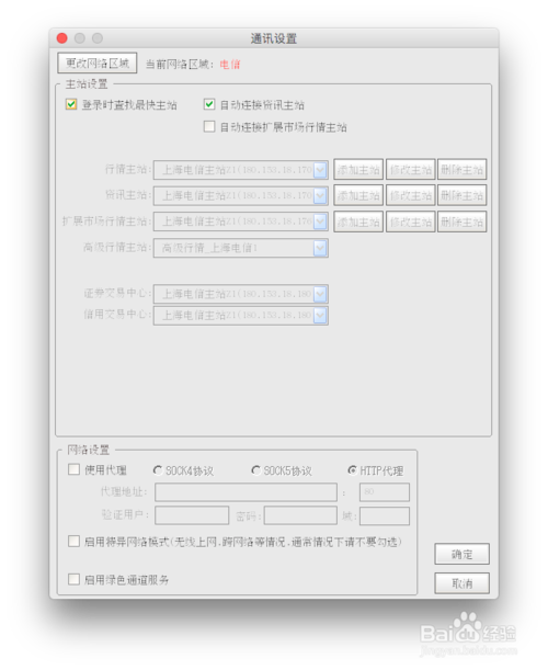 6.在中信证券的主界面,点击“通讯设置”按钮。然后在弹出的窗口中,将“登陆时查找最快主站”选项去掉,点击“确定”保存。到这里,我们就成功在 macOS 安装了中信证券了,一切就和在 Windows 使用一样。