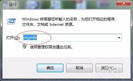 在运行对话框输入指令“regedit”,单击回车弹出注册表对话框