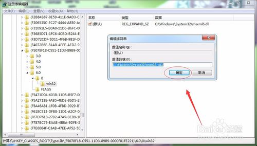 在弹出的编辑字符串对话框输入新的地址“C:\Windows\System32\msxml6.dll”单击确定,然后再去看下是否就可以安装软件了