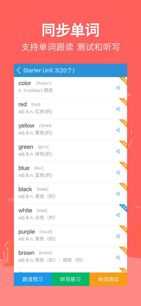 教材单元同步单词,真人发音,支持单词跟读、测试和听写。