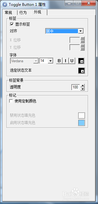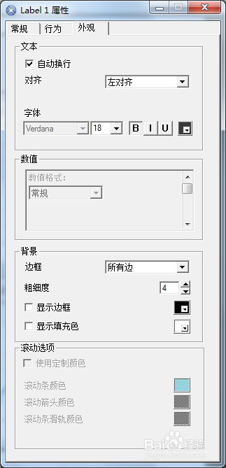 标题标签部件的设置。在“常规”选项卡中输入标签内容,在“行为”选项卡中可设置动画和效果,在“外观”选项卡中可设置文本的字体、大小、颜色、边框等。