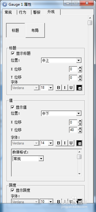 量表部件的设置。选择第一个量表,将它的标题设置为SheetZ的AIO,值设置为B门O,最小值限制为O,最大值限制为5000;启用警报,占目标百分比设置为SheetZ的C10,百分比可根据需要输入,颜色也可更改;颜色顺序选择“高值为好”。第二个、第三个量表的设置与此类似,第二个量表的最大值限制为1000,第三个量表的最大值限制是3000。