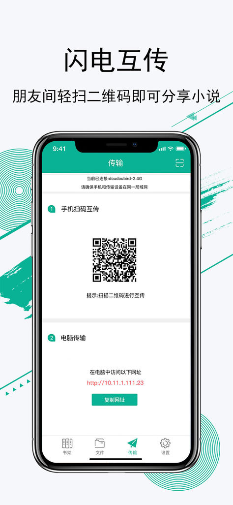 【文件互传】支持手机与手机间的无线传输,朋友间扫描二维码,即可轻松完成书籍、小说、有声读物的分享。同时,支持电脑与手机间的无线传输,打开电脑浏览器,选中目标文件,点击发送即可。