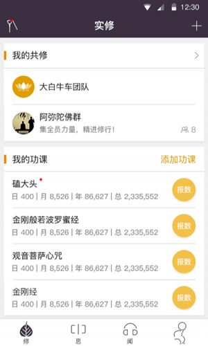1、功课设置非日目标时,可自动获取日平均值;2、共修群的累计修行数会根据加群时间统计;
