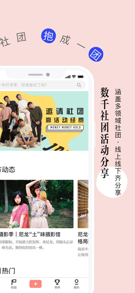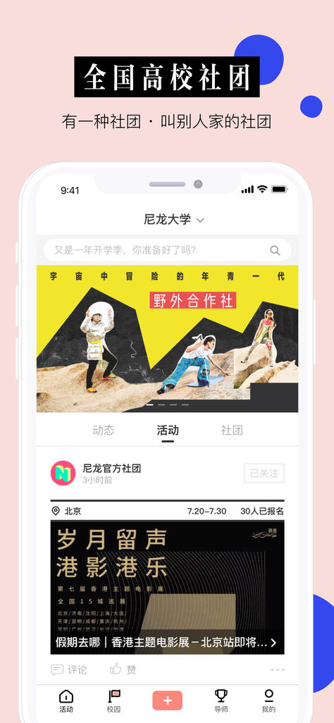 在尼龙app你可以找到:超过三万个中国高校学生兴趣社团,涵盖文艺、体育、科学、创业和公益等各个领域。即时 交流,没有阻碍。