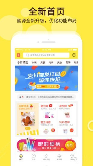 全新首页:蜜源全新升级,优化功能布局购物先领券:海量商品,超多优惠券等你来拿