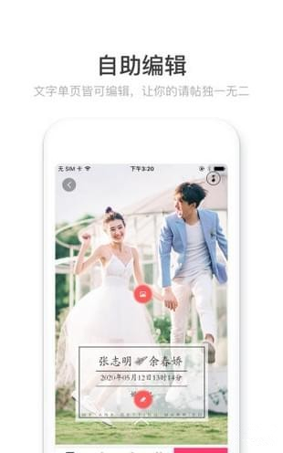 2.便捷分享:支持微信、朋友圈、qq、QQ空间等分享,和亲友一起见证感动时刻。3.自助编辑:告别同质化,支持编辑文字、添加单页,做你的专属请帖。