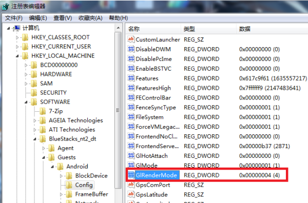 2、导航到HKEY_LOCAL_MACHINE\SOFTWARE\BlueStacks_nt2_dt\Guests\Android\Config