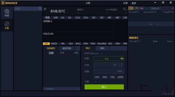 币安交易所客户端(binance)是币安交易所的pc客户端软件。用户可以通过这款软件实时了解比特币、莱特币、以太坊、币安币等区块链资产价格波动,实时了解最近的交易行情信息,非常实用。
