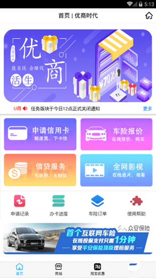 优商时代合作国内20多家银行信用卡专属办卡渠道,数10家信贷机构,众安保险全部险种,保骉车险(众安平安联合车险,享受平安vip理赔服务,大数据计算最低保费)提供在线便捷服务