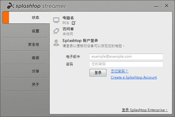 1.首先下载并安装Splashtop Streamer,下载安装后可以看到一个很简单的小对话框画面,这里面我们主要关注两个栏目一个是状态栏,另外一个是安全性。状态栏里面我们可以把自己的splashtop帐户添加,一般是邮箱形式的帐户。而安全栏可以设定我们被远程控制的电脑,在被远程控制时的控制密码,避免被恶意控制。