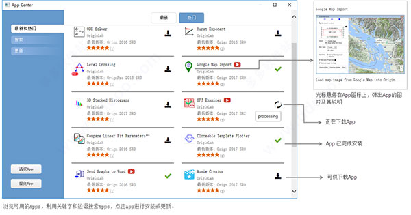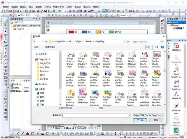 OriginLab 2018年初发布了旗舰科学绘图和数据分析工具——OriginPro 2018,新版本对之前版本进行了许多小改进,使得在一些细节方面更加完善,比如:为二次开发设立了App Center、在文件资源管理器中预览Origin的图形、单元格公式输入和表达能力得到增强、改进了Origin Central 对话框、增强的图例自定义功能、增加了图形参照线功能,增加了桥梁图(瀑布图)、带自定义边界的4D XYZ 图、双Y轴箱形图、均匀分布图形对象或图层、支持图形输出区域微调,以及诸多对于双Y轴柱状图,可以单独控制分组间和分组内的间距、对3D墙图,支持明暗效果等改进。OriginLab OriginPro 2018提供全面的图形和分析解决方案,拥有强大的数据分析能力和专业绘图能力,数据分析主要包括统计、信号处理、图像处理、峰值分析和曲线拟合等各种完善的数学分析功能,进行数据分析时,只需选择所要分析的数据,然后再选择相应的菜单命令即可。Origin的绘图是基于模板的,Origin本身提供了几十种二维和三维绘图模板而且允许用户自己定制模板,还可以自定义数学函数、图形样式和绘图模板,可以和各种数据库软件、办公软件、图像处理软件等方便的连接。