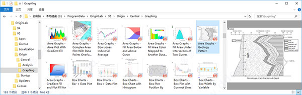 ·在Windows的文件管理器中浏览Origin项目文件OPJU。 中间窗口的大图标显示文件中最后激活的图形的预览图片。右侧的预览窗口显示更大的图形预览图片,利用·其垂直滚动条,以浏览OPJU项目文件中所有图形的图片。