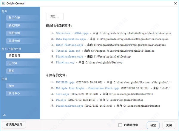 在Origin Central对话框的项目文件选项卡,可以快速访问最近使用的Origin项目。最近被编辑过但未保存的项目也会列在未保存的文件下,并可恢复到编辑时的版本。