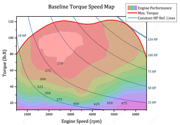 对发动机扭矩速度性能绘制图,并以最大扭矩线来自定义轮廓图边界。使用以下表达式添加了各种马力值的参考线:Torque=HP*5252/RPM