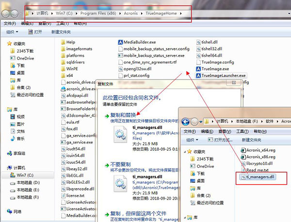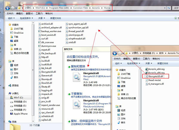 3.将破解补丁“libcrypto10.dll”复制到C: \ Program Files (x86) \ Common Files \ Acronis \ Home目录下,按提示点击“替换”