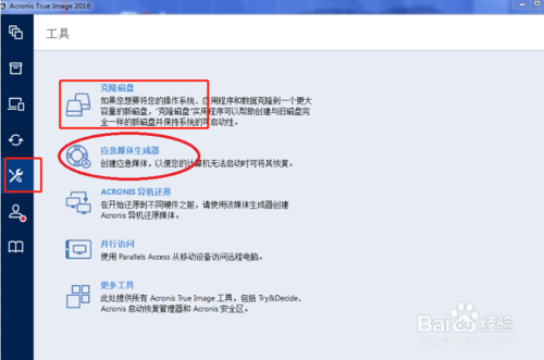 这里我们点击工具选择克隆硬盘或者应急媒体生成器,区别情况图片说明,这里我们以应急说明