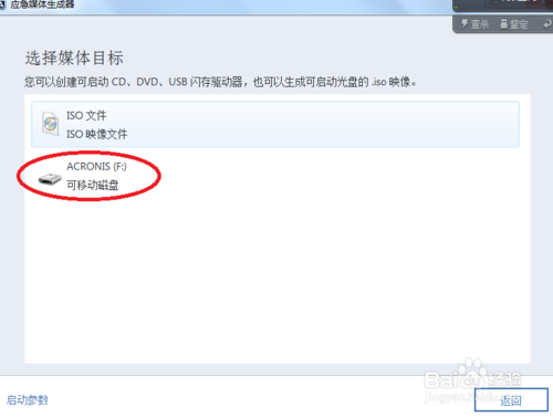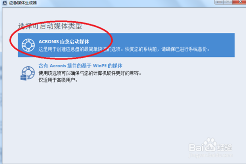 在上一步中点击应急媒体生成器,出现下面界面,点击ACRONIS应急启动媒体,这个主要是用于创建应急盘的最简单快速的选项,