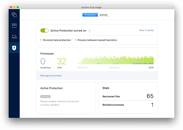每个版本的 Acronis True Image都附带防勒索功能Acronis Active Protection,这是人工智能和基于机器学习的技术,可以检测并阻止勒索软件,并自动反转其影响。兼容所有顶级的反恶意软件解决方案。