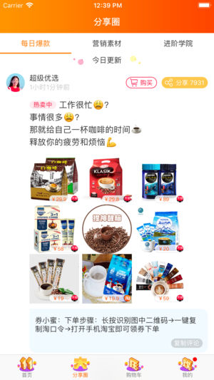 2、商品全:汇集了淘宝、天猫男装、女装、鞋包、护肤品、数码、天猫超市、聚划算、淘抢购、母婴、日用品、零食等百种优惠券,更有9.9专场、品牌特卖专场、限时抢购、猜你喜欢板块,让用户轻松享受一站式购物乐趣。