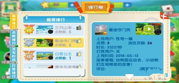 《天天讲故事》儿童自媒体平台,不单能听到好故事,还能陪孩子一起选择场景和道具一起创作故事哦~~~。如果创作出好的作品,可以上传到平台,审核通过后就可以分享到全世界让大家都看到啦,而且还可以还可以交流心得体验呢。平台还提供了大量文章和绘本供孩子朗读,读的好的话也可以参与排名哦。