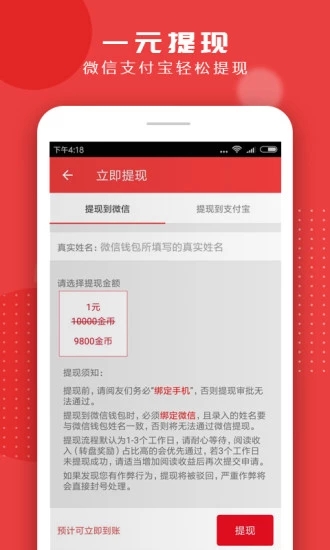 超给力提现:一元提现起,天天都可1元提现!只要够努力,这里就是你的提款机繁多的任务系统:定时抢宝箱,每小时抢红包,每天签到红包,新闻奖励,视频奖励,等等等等,最终目的,就是送钱,毕竟是西红柿首富嘛。