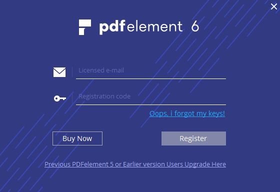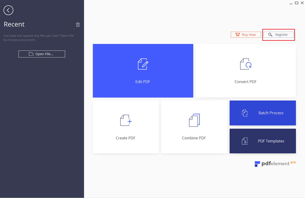 步骤1: 启动PDFelemen产品,然后单击主窗口右上角的“注册”按钮。