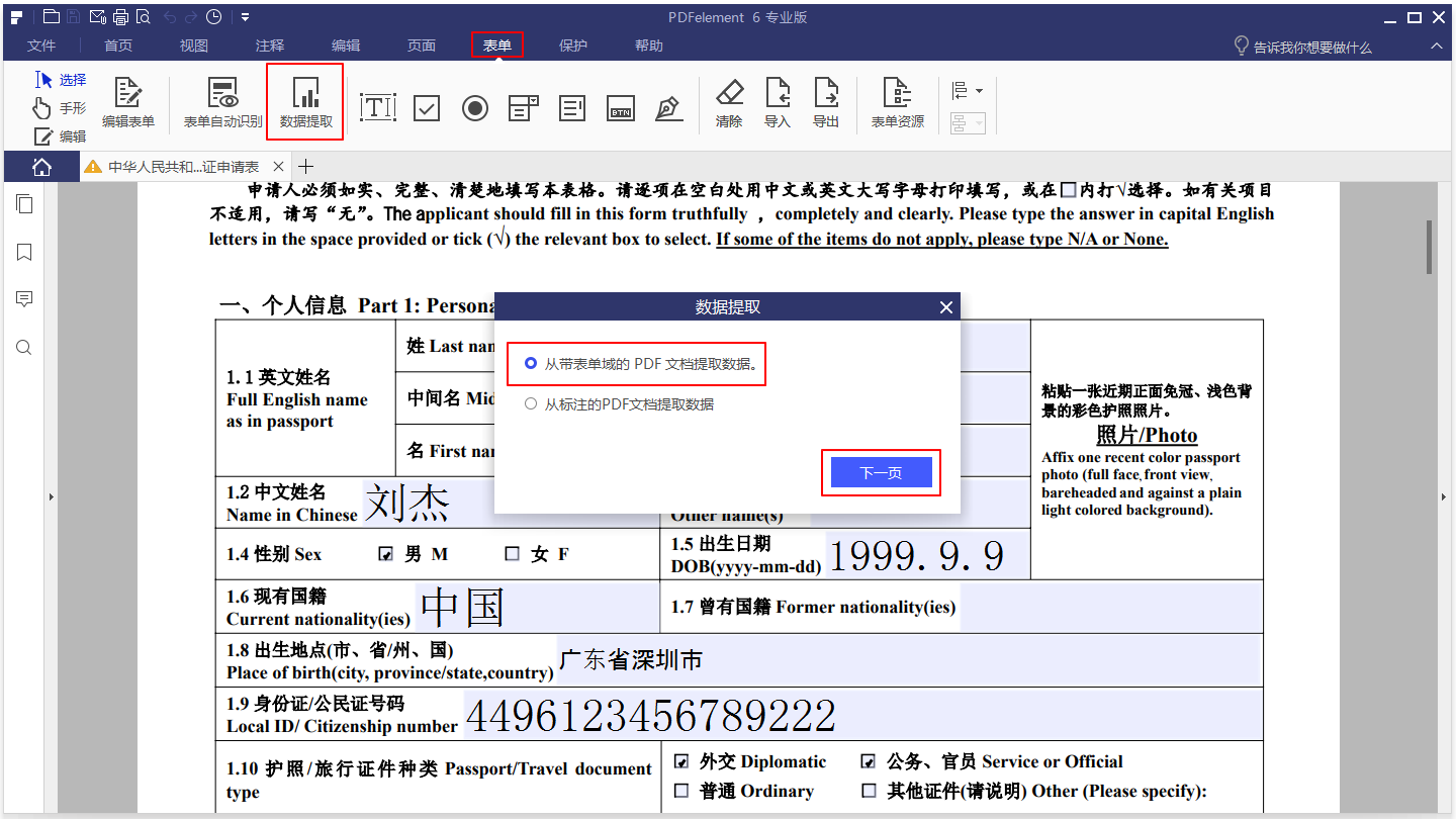 如果您的PDF文件是扫描文件或可填写表单,您可以单击“表单” > “数据提取”按钮,然后选择要使用的方法。