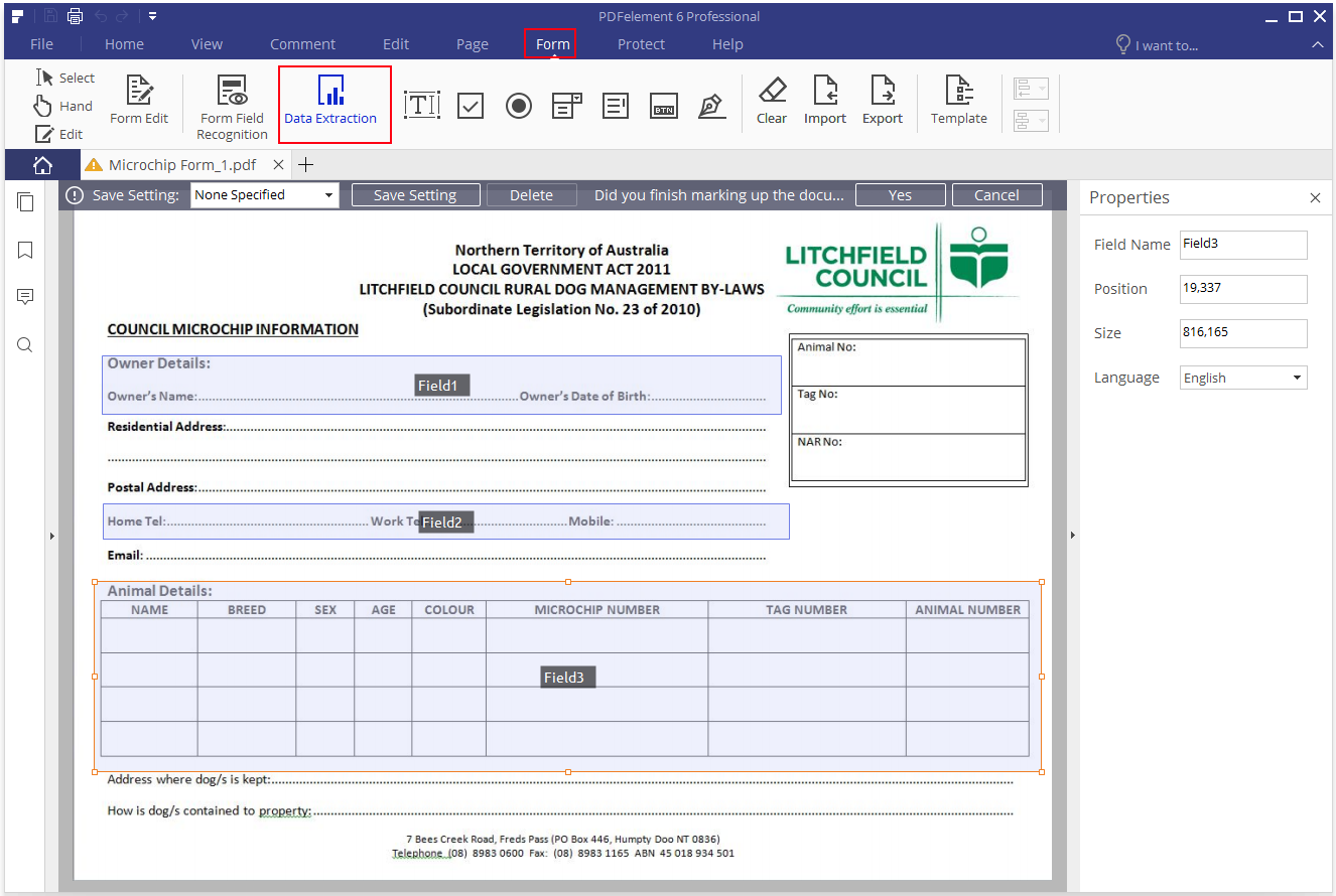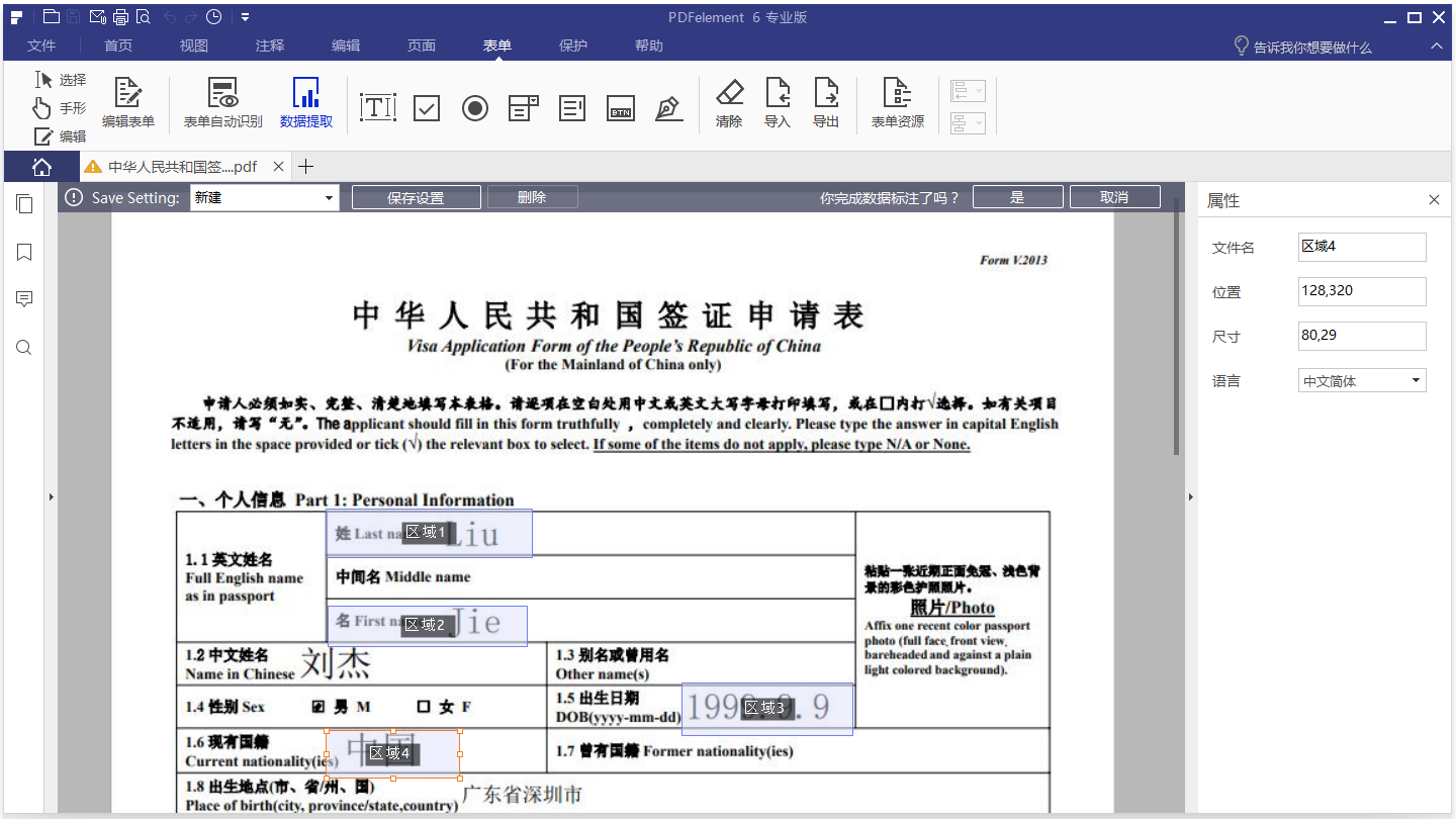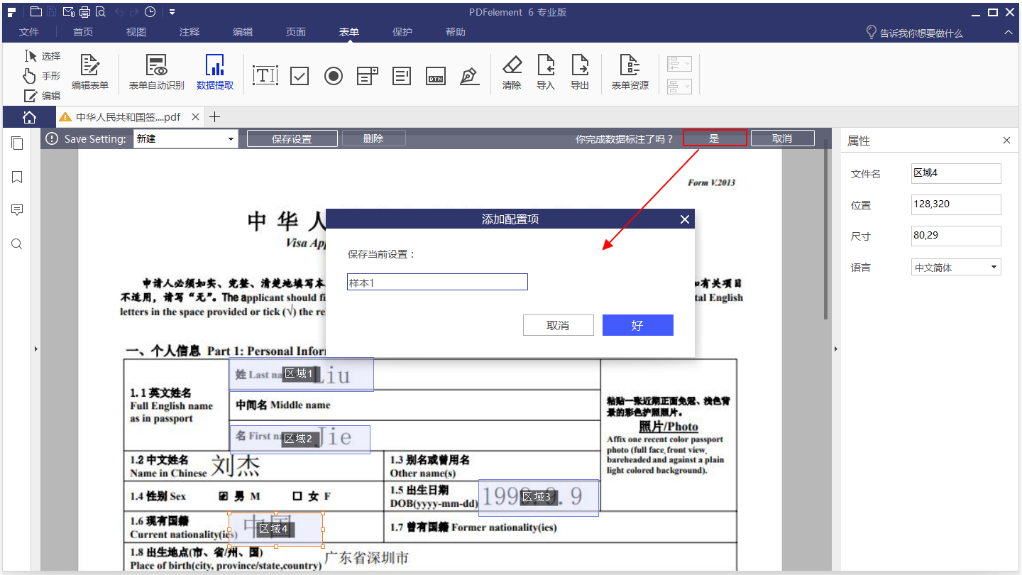 如果您提取多个扫描文档的数据,您预先设定的区域将会出现在右侧,在这里,您可以选择需要用于提取的设置。如果设置不对,您需要返回打开扫描的PDF文件,然后单击“表单” > “数据提取”按钮重新设置您需要处理的文档区域。
