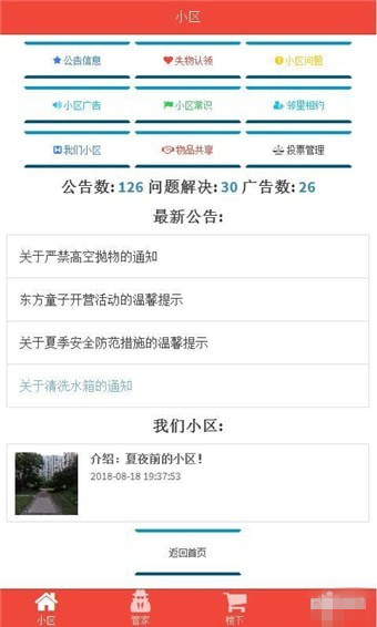 1、为业委会和业主提供小区中的交流和管理功能,包含公告信息、小区提问、失物招领、邻里相约、常识查看、小区广告以及小区介绍等等,通过技术支持美好生活。2、为物业提供物业管理能力,提供如访客申请、物业报修、物业公告发布等功能,便于物业对小区进行管理,流程性过程与业主的交流。