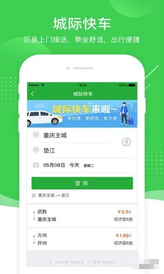 1、汽车票:实时查看车票余量,购票后自助终端取票乘车。买票不排队,出门不打挤!2、城际快车:上门接送,快速直达,公运车辆,专业服务!