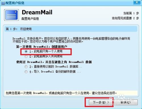 2.配置用户信息,如果是第一次使用而且你的电脑只有你一个使用 话,那就选择第一项,如图: