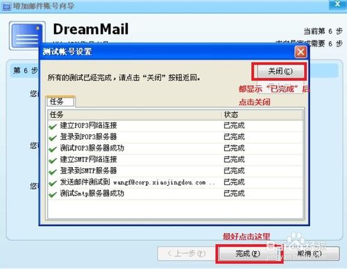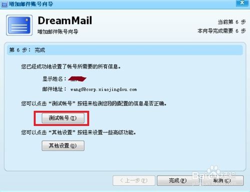 6.点击“测试账号”按钮,如果测试通过了,点击“关闭”按钮,最后点击“完成”按钮