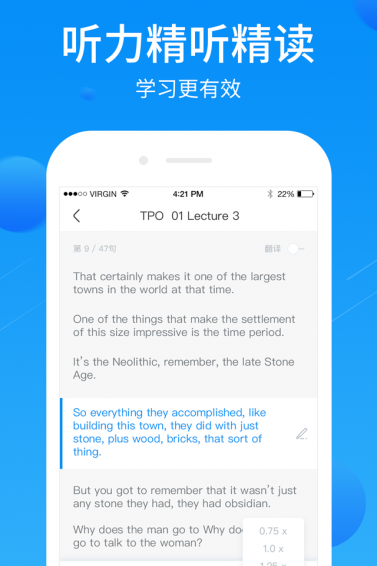 精听模式训练,以句为单位切分,支持音频变速,单句反复练习,迅速提升听力水平