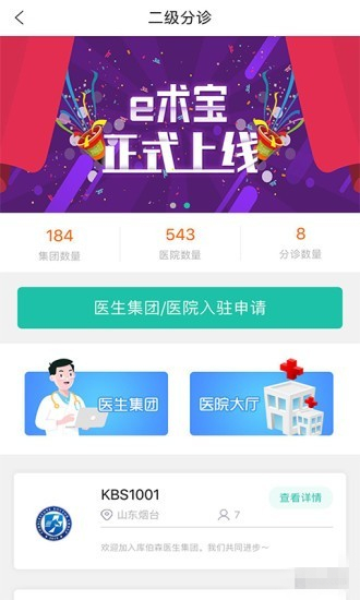 e术宝app为经销商、医院、手术的跟台人员进行服务。医院手术使用的医疗器械由经销商或器械厂家提供,在每次手术中经销商会提供跟台人员在手术中进行医疗器械的操作,跟台人员获取相应报酬.e术宝app提供的服务为厂家或经销商可以通过e术宝APP进行发布手术信息,以及跟台费用,跟台人员可以通过注册进行报名,手术结束后跟台费用会转入跟台人员账户中。