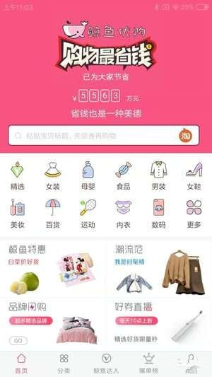 鲸鱼优购app每天汇总各大商城的品牌折扣商品,名品轻松拿,不花冤枉钱。