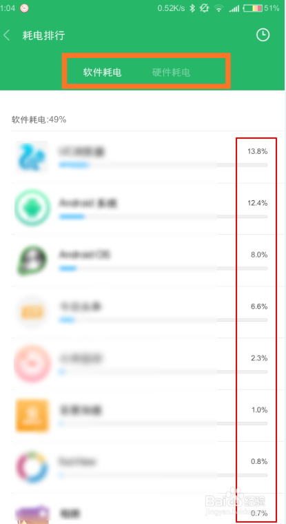 3.点击图中的电池图标,然后就会看到哪个APP最为耗电,如果是耗电不正常,那么这个APP很可能是流氓APP,会造成手机发热电池爆炸的危险。所以哪个耗电从这里一目了然,方便给予卸载的依据。