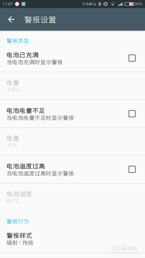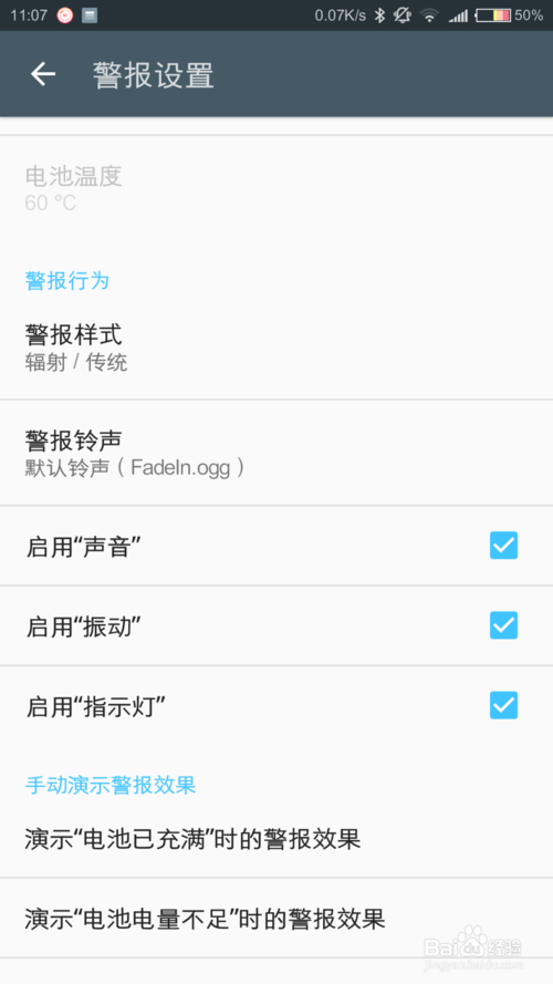5.然后选择电量过低或者温度过高警告,这个方便在使用过程中,防止手机出现意外的情况。