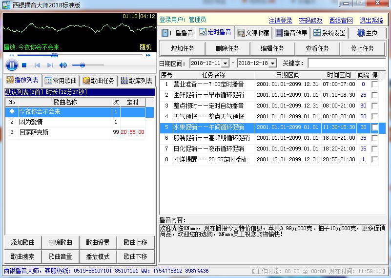 1、【播音任务】,你可以定时、循环播放促销广告(例:生鲜区:排骨原价16.8元/斤,现价10元/斤)。2、【广播播音】,你可以临时插播(例:移动汽车词:车牌号为***的车主请移一下您的车辆等)
