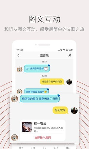 在房间和听友图文互动,畅所欲言,感受最简单的文聊之旅。