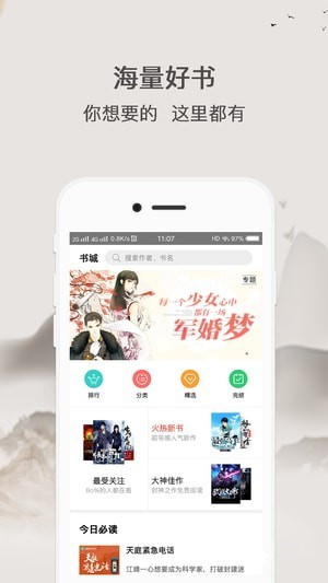 【海量小说】百万小说随便看,玄幻奇幻、武侠仙侠、都市言情、青春校园、穿越架空、惊悚悬疑、历史军事、耽美同人、官场权势、职场竞技、科幻灵异、热播剧原著、文学经典、名人传记、励志故事、经管理财,娱乐体育等经典图书。