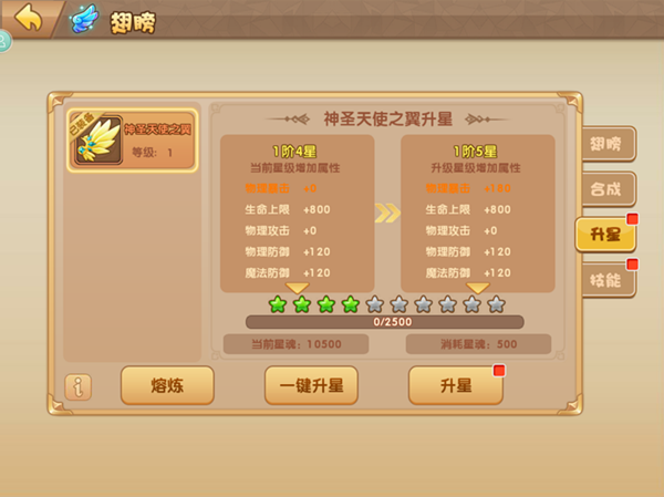 除了升级翅膀还有星级属性,同一等级的翅膀升的星越高所加的属性也会越多,跟升级不同的是升级每提高一级所加的属性是所有的,而升星每升一星所加的是某一属性,当时加成会比升级高。升星会消耗星魂,但是如果以后有了更好的翅膀那这个翅膀不就废了么?不会的,可以选择熔炼,就可以把翅膀的降会初始属性,同时会返还所有星魂和部分翅膀残片。