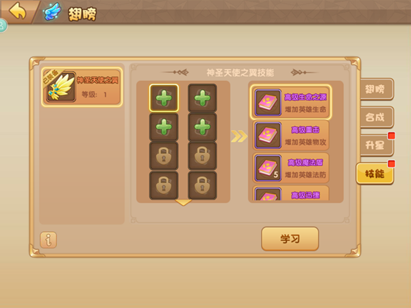 除了升星和升级,翅膀也是可以学习技能的,随着翅膀等级的提高,翅膀的技能槽也会对应增加,最多可以学习十个技能,玩家可以搭配自身的职业来搭配翅膀的技能,战士就可以选择增加防御和生命以及物理攻击,法师则可以选择法力魔法暴击以及魔法暴击伤害加成,搭配方式花样十足。翅膀的技能也是可以升级的,升级消耗相同技能书,技能等级越高消耗越多,对应的加成也越大。