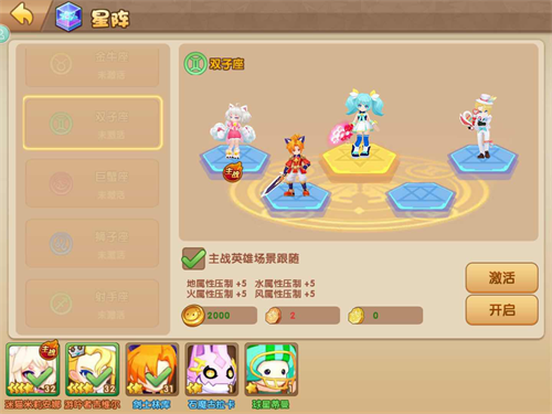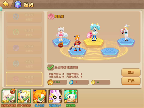除了英雄和主角能发挥出元素力量外,部分星阵也是能增强元素属性力量的。目前开启的八个星阵中双子座和双鱼座都是能增强元素属性力量的。双子座能增强元素属性的攻击性力量,每种属性压制+5。与之相对,双鱼座属于防御星阵,能增强元素属性的防御性力量,每种属性抵抗+5。激活星阵后,结合元素属性,会大大增强游戏的策略性哦!