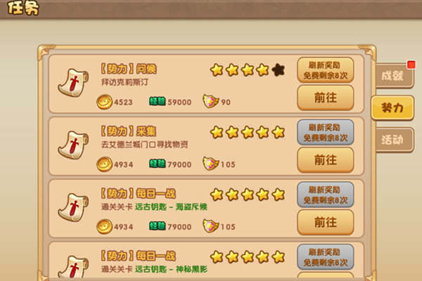 任务这块的资源主要分成三块:成就、势力和活动。成就这块不用特别关注,反正在打怪升级的过程中就慢慢完成了。活动也是每日必做的,主要产出经验和金币,是英雄升级的最大资源库。势力的奖励则是分星级的,每天有七次免费刷星机会,星级越高获得的资源就越多。大家每天在开始游戏之前别忘了去刷新下势力任务的星级,这样才能最大限度拿到资源,强化自己。